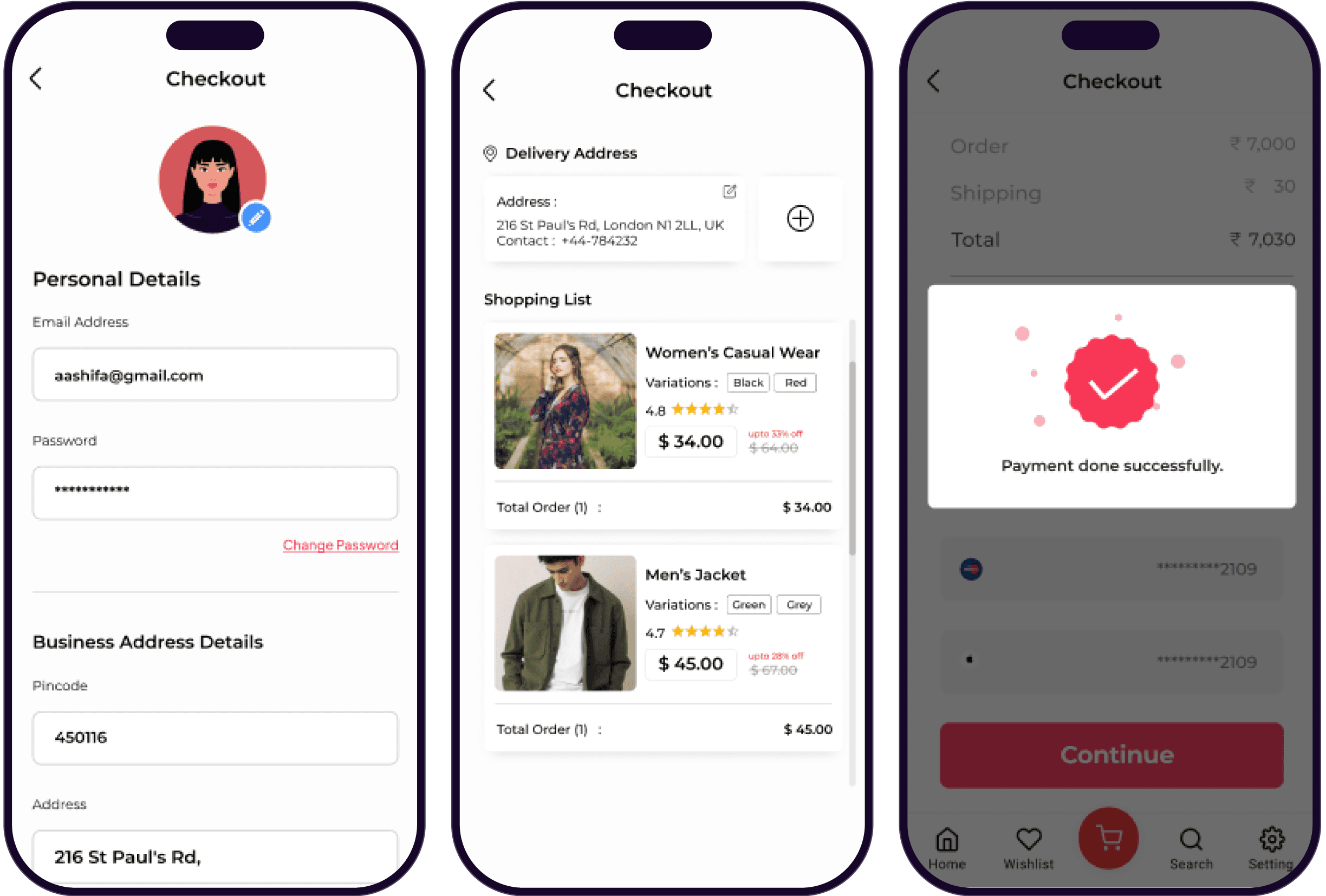 The checkout flow is optimized to minimize friction. Users are guided through a step-by-step process, from entering personal details to confirming the delivery address, and finally to a streamlined payment confirmation, all designed to reduce cart abandonment and increase successful transactions.
