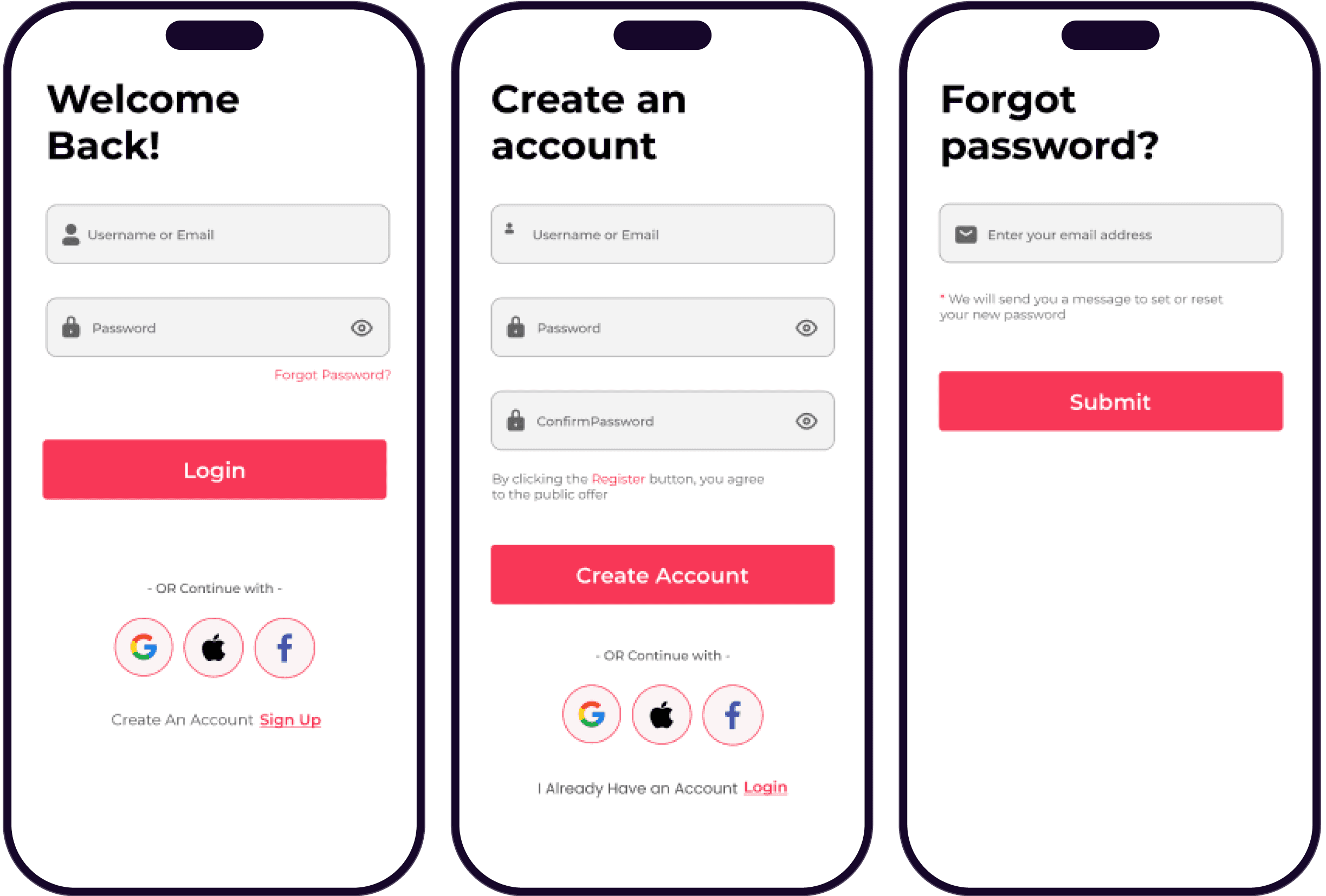 The login, account creation, and password recovery screens are simplified, offering users multiple sign-in options, including social media integrations, to expedite the process while ensuring security. The clear, user-friendly entry points into the app are designed to enhance user retention and build trust from the outset.