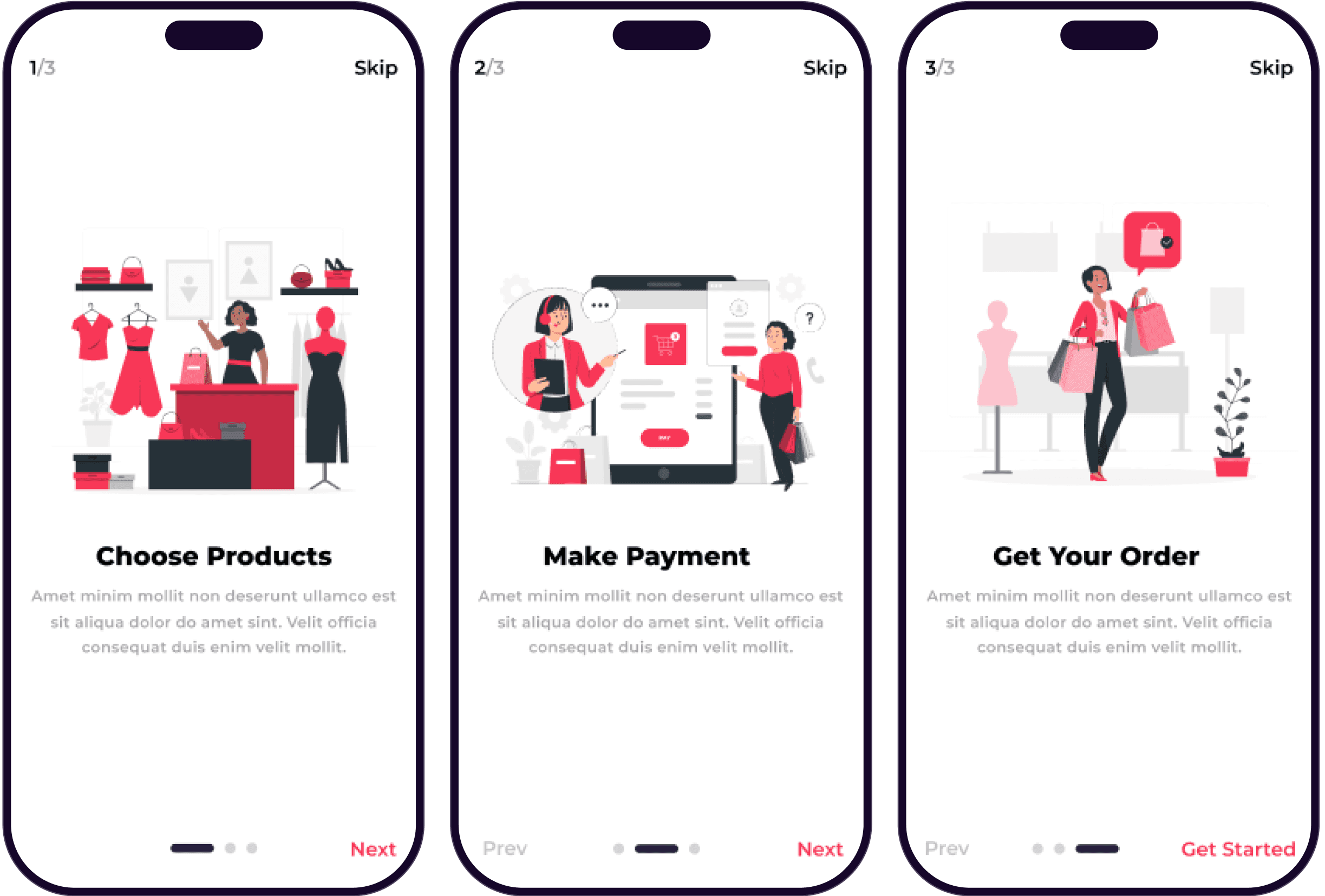 The onboarding screens are thoughtfully designed to walk users through the app's primary features, fostering immediate engagement. The 'Choose Products,' 'Make Payment,' and 'Get Your Order' steps are illustrated with intuitive graphics, setting clear expectations and promoting ease of use from the first interaction.